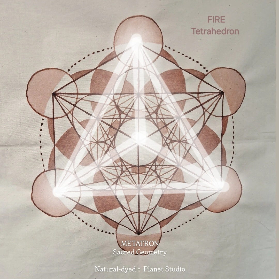 Planet studio made this Metatrons Cube of Sacred Geometry for you by natural Dyed of hand printed include which The Elements with Earth,Fire,Aether ,Water, Air ,Mer.Ker.Bar ,The Seed of Life, The Fruit of Life。星球工作為您製作這幅 梅塔特隆 神聖幾何圖形, 使用天然草木煮染,以大地色彩緩慢繪製。包含土, 火, 水, 氣 ,乙太 元素;生命種子,生命之果,星光四面體梅爾卡巴。